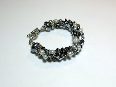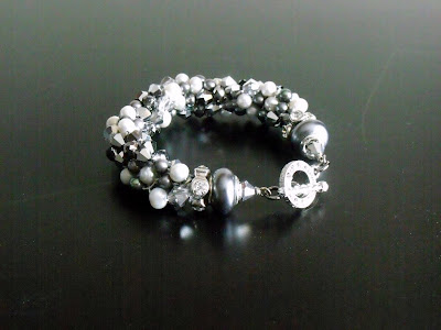 In case you missed the preview of this bracelet before it was finished, I loved the smoothness of these light and dark grey cultured pearls, and decided to try using them in a Kumi bracelet. I paired them with shiny sparkly metallic platinum colored bicones. I thought the round smoothness of the pearls would go good with the triangly smooth edges of the bicones. Some are metallic on all sides which really gives the bracelet extra sparkle, and some have a metallic and clear glass effect on one side, which add a slight feeling of depth and variety.