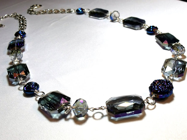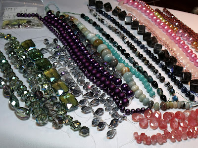As you will see below, I think I did very well and found some really cool and beautiful beads, as well as a few unique looking ones. I snagged lots of larger crystals with different reflective hues - greenish tints, blue/purples, and oranges - in a variety of shapes - globes, large and smaller drops, flat teardrops, rectangles and hexagons. I also chose a few faceted round quartz in different blue mixed shades, various dark purple and pink glass pearls and crystals, beautiful cherry quartz faceted briolettes and small drops, light pink quartz discs, and large square labradorite. I also scouted out this great light aquamarine jasper mix in graduating size rondelles. Hope you enjoy my finds. Now it's time to put my creative hat on, and make some great jewelry pieces.