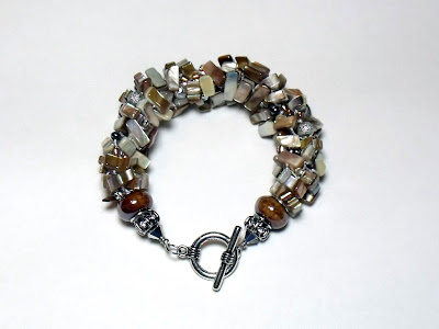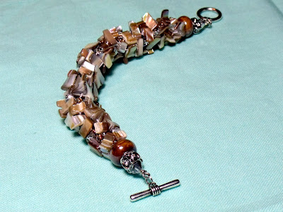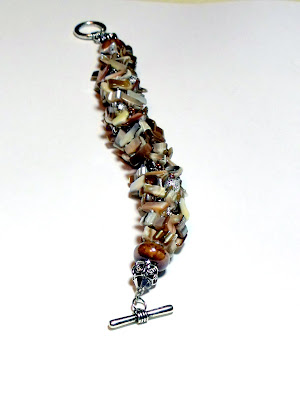 Additional pics can be found in the $20 and Up Bin https://picasaweb.google.com/107300574423774597919/20AndUpBin?authuser=0&feat=directlink .And finally, here in Florida we have a lot of beaches and shells are everywhere. They also seem to be "in" in the fashion world. People love them and seem to gravitate to them like women near a chocolate store. Well, luckily I love them as well, which is why I picked out these lovely brown multi-colored shells. They have a real smooth pearlescent look that seems to shimmer from all angles, but you can still see that they are definitely shells. Since they are shells, mother nature naturally enhanced them with various shades of brown and various other colors, such as dark cappucino, light mocha, a neat caramel color, goldish-brown, and silverish-white. Shell and brown color lovers I think would adore and appreciate this bracelet. For added sparkle, I added dark brown beads that seem to almost glow they are so shiny, and large rhinestone metal beads, along with a polished looking silver plated toggle clasp. Now due to the different sized shell pieces, this bracelet is about a four out of five on the chunkiness meter, but it still wears easily for people who like or don't mind the chunkier bracelets. It measures 9" in length, but will fit a 7" wrist comfortably. I sure hope you love this Shimmering Shells bracelet too, like I do!