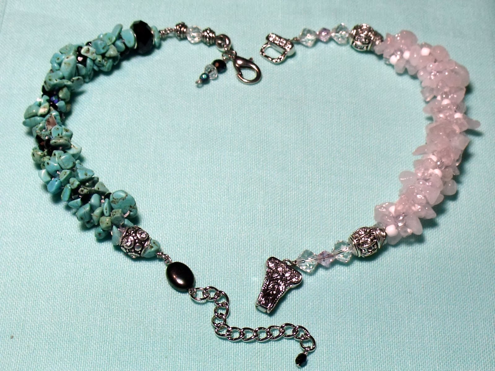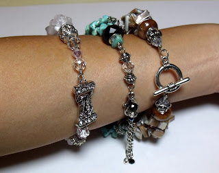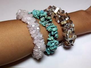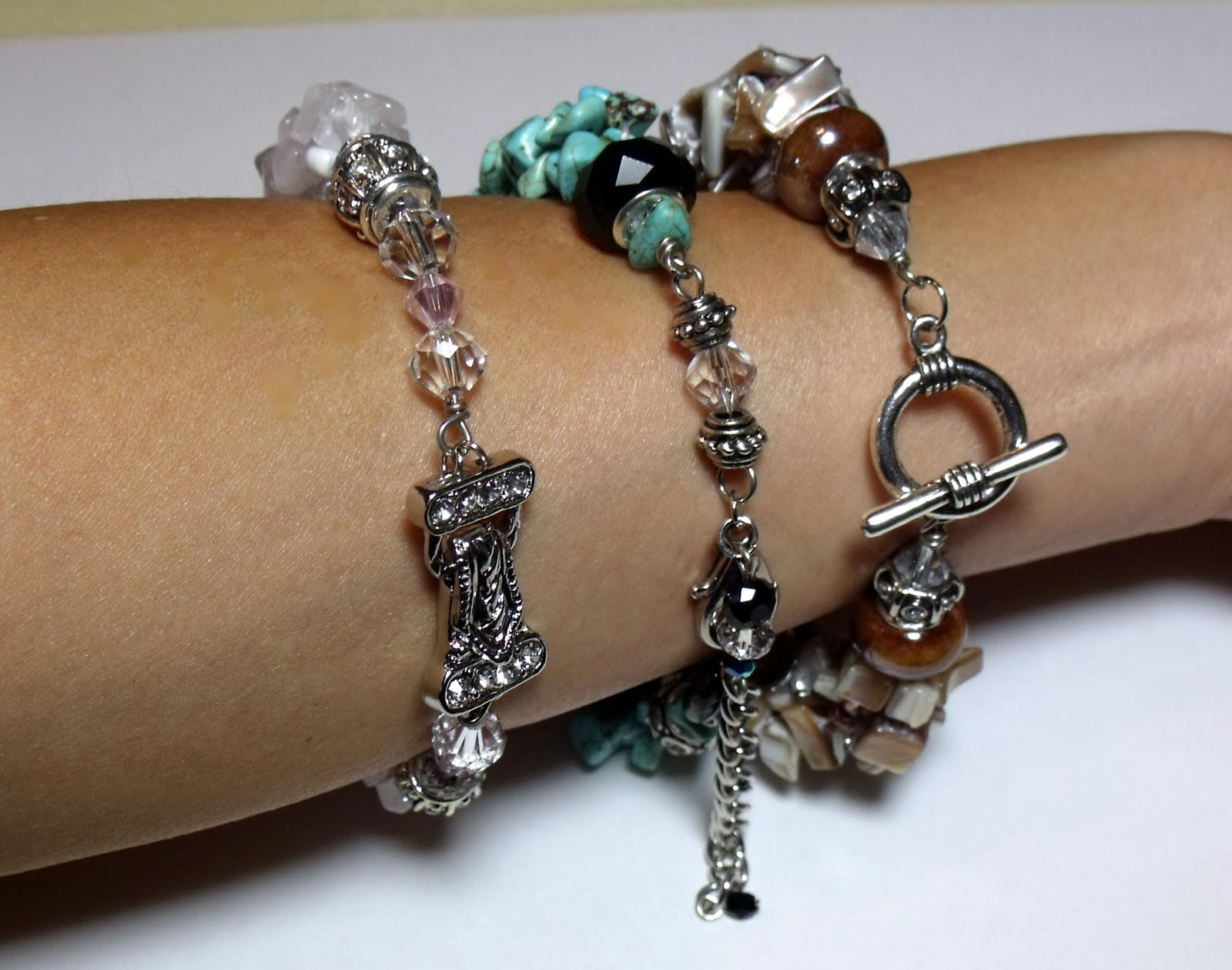 Here are all 3, Turquoise Lover's Delight, Rose Quartz, and Shimmering Shells, together on the wrist with front and clasp view.