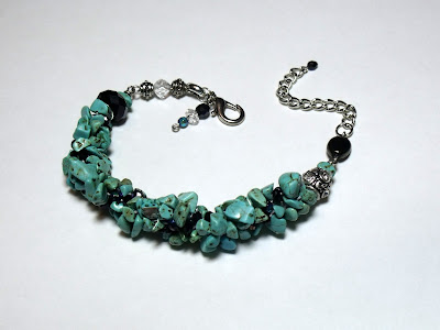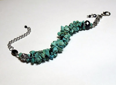 First up, Turquoise Lover's Delight. Just as the name says, this bracelet has a generous amount of turquoise pieces braided using the Japanese Kumihimo technique. I wanted to add a little bling, so I added black sparkling crystals which appear to nicely wrap around and in-between the turquoise pieces. Such a lovely look and feel. It has a lobster clasp to make a more flexible fit in size and wear. This fits a 7" - 8 1/2" wrist, but I can custom make you one with a smaller or specific size if desired - just state the size you want in the ordering process. It also has a small dangle for extra cuteness. Turquoise and jewelry lovers both I think will love this bracelet!