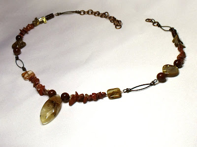 Mother earth tones are in this season. So I wanted to show you my latest creation in honor of her fall hues - browns, oranges, reds, and yellows. I named it Burned Orange Brecciated Jasper Necklace with Quartz Pendant for the burned orange Jasper pieces as the main colors, nestled in with hints of reddish-orange poppy jasper rounds, deep yellowish-brown coin-shaped shells, shell pieces and brown shell rondelles. Hanging in the front and center is a beautiful multi-colored quartz pendant with orange-yellow and brown inclusions. Finished with a mixture of brushed brass and copper chain and lobster clasp, it will hang nicely from 22"-25". This beauty just reads autumun to me, and is too pretty to pass up, so don't miss out! More pictures can be found in the $20 and Up Bin to the right, or you can buy it now below.