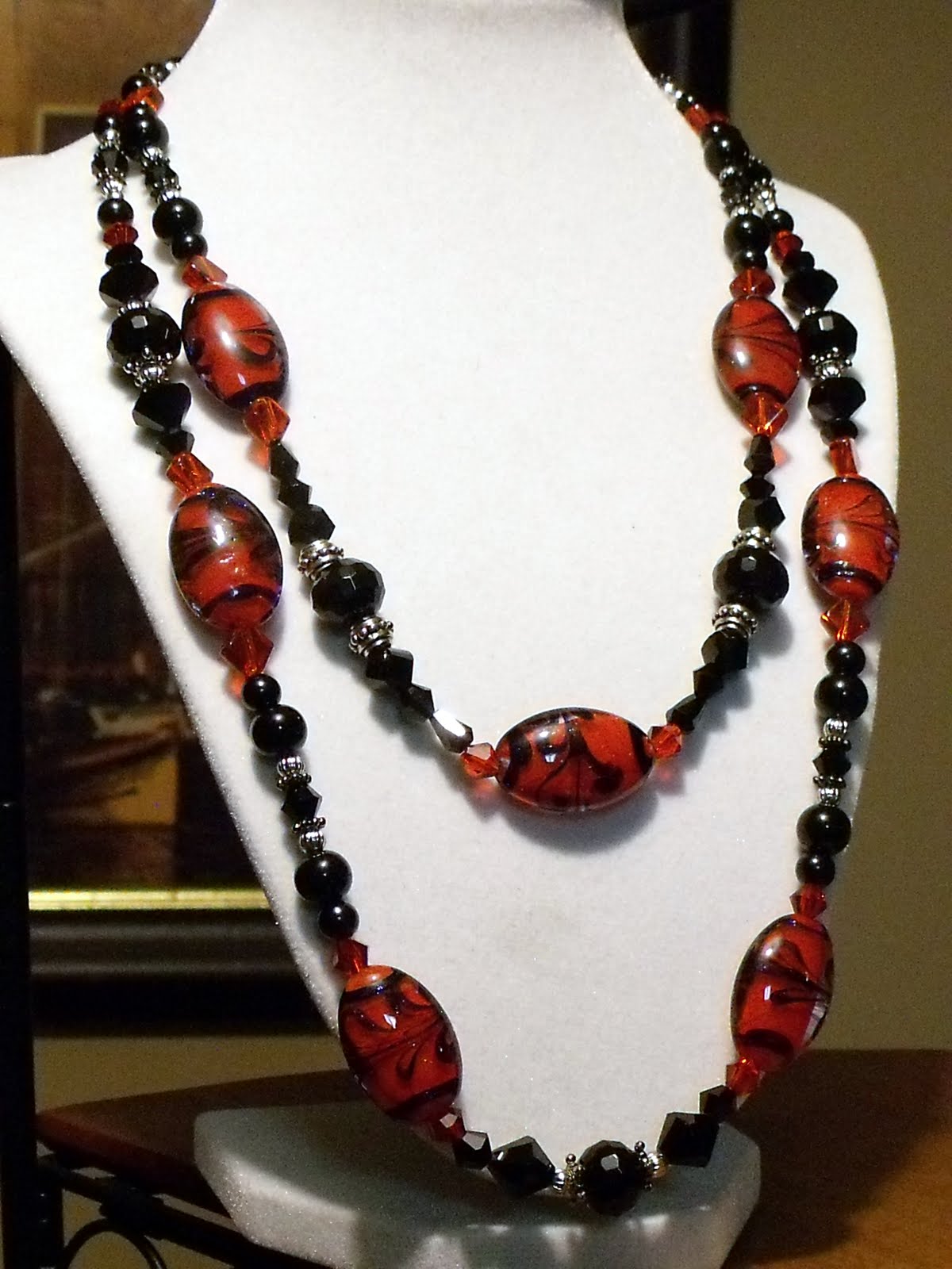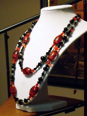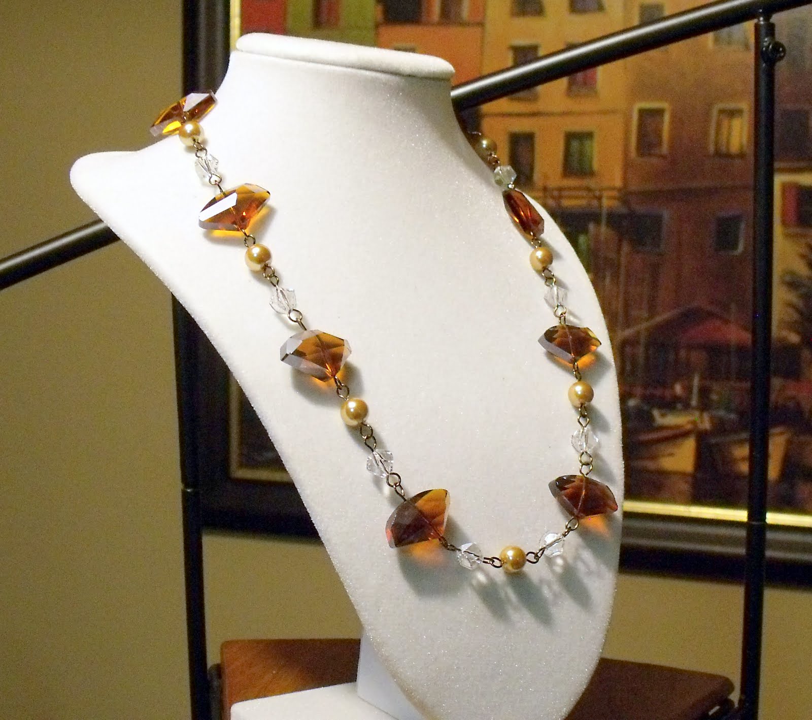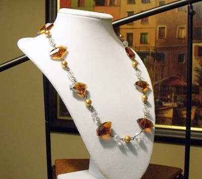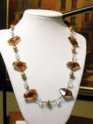 I found these great amber colored prisms, for lack of a better term, at River City Beads. I'm sure there's a word for the shape of them, I just don't know it. I just know I loved the shape of them... it's different and really pretty. Thought they would make a wonderful delicate, elegant, unique necklace. I mixed in a few yellowish-goldish colored glass pearls, clear glass prisms, and voila! Also kept with the warm theme by using copper chain and lobster clasp for a complete look. Really love this one for fall/winter fashion and at such a great value. Hope you love it too!