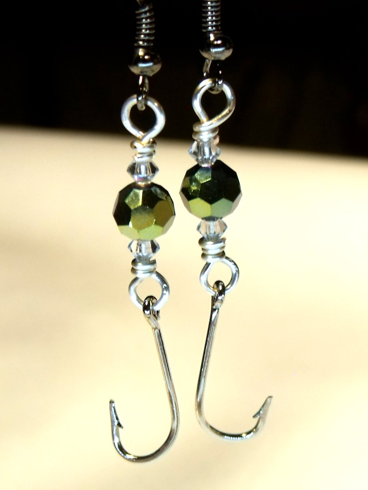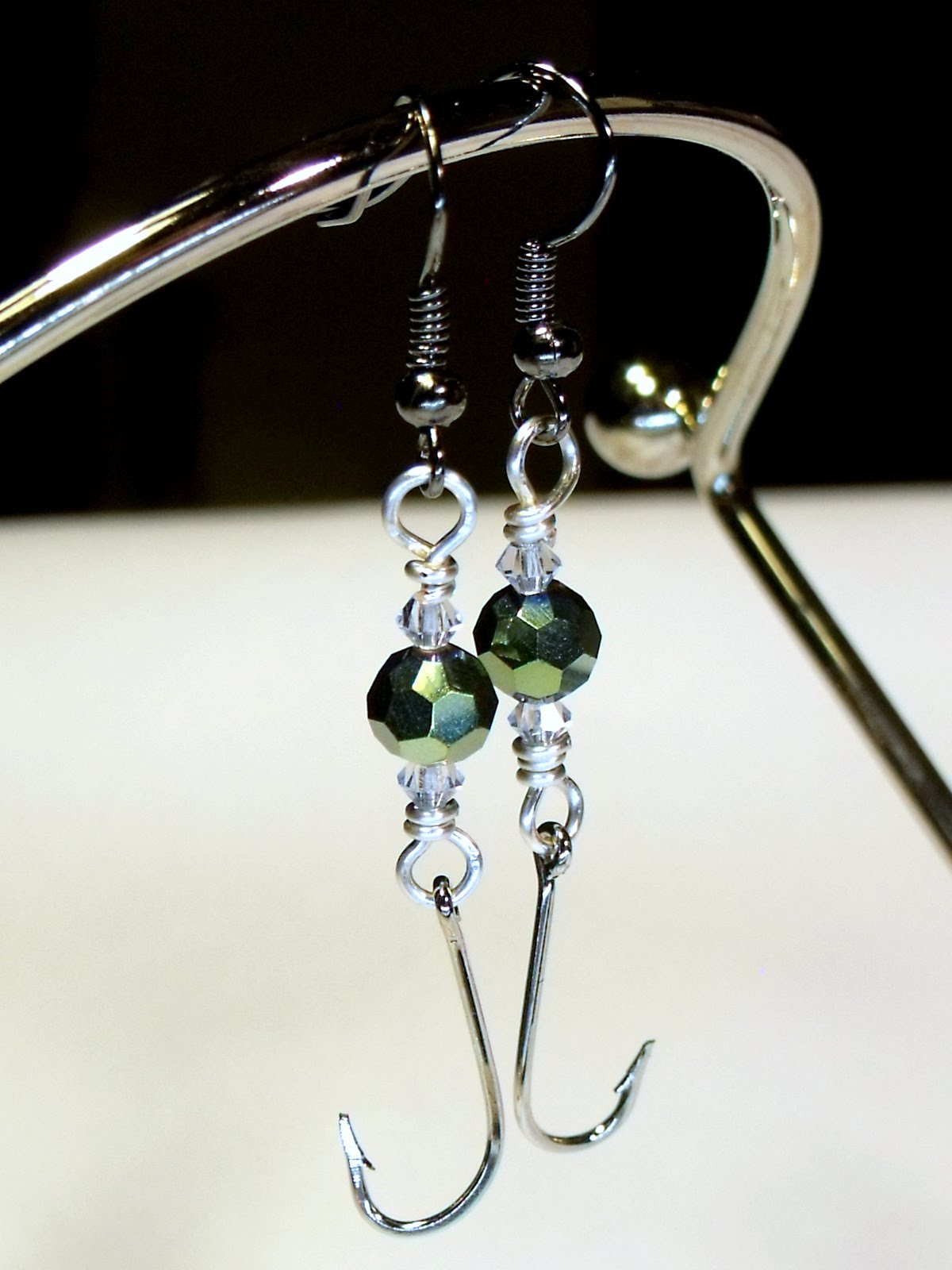 Just a quick post to show you another pair of fishhook earrings made for a co-worker's son's girlfriend. Apparently she loves fishing, and these were a great gift idea. Two smaller metallic green faceted round beads with an additional clear crystal bicone both above and below it, make up the main body of these earrings. Yes, that's a real stainless steel fishhook dangling from the crystal bead... No worries, the tip and barb have been cut off and sanded so no actual hooking or stabbing is involved for the wearer. They're quite versatile too - I've done several different versions using different beads and combinations, and just about any bead looks good as a fishhook earring. They really stand out, and are just the cutest fishhook earrings don't ya think? Love them! :)