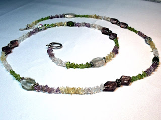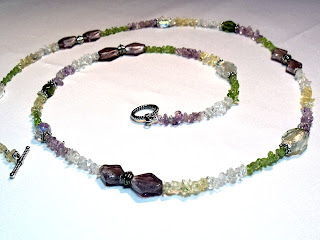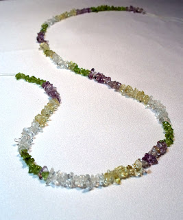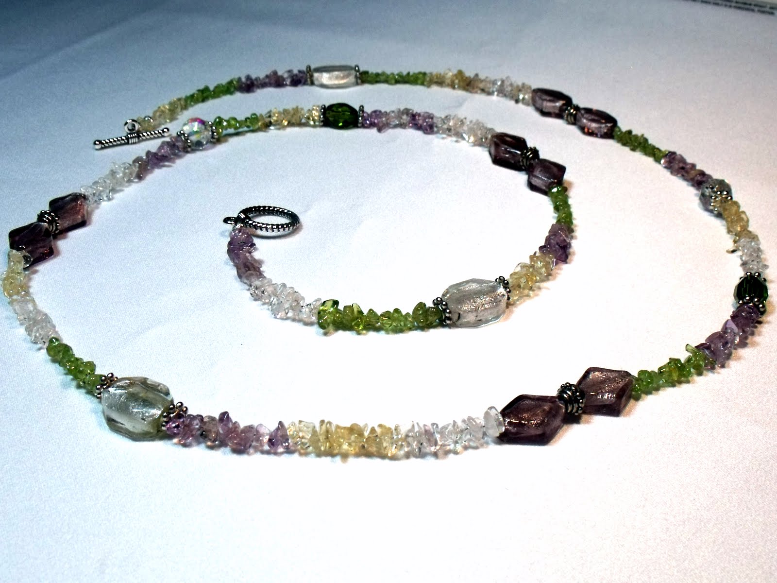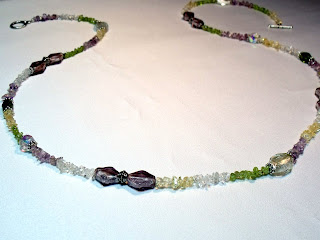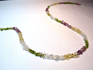 I did want to show you a necklace that was a sort of partnership with a friend at work. She brougt in this beautiful springy colored lanyard - it had these lovely glass chips of green, violet, white, and light amber. She's been a fan of mine for some time now, and appreciates many of the details and craftmanship I put into my work. So when she brought me this lanyard simply attached on a string and said to see what I can do with it, I was excited about fancying it up a bit for her. I went easy on the bling factor, since she wanted to be able to wear the necklace with as many outfits as possible, and didn't want it too fancy. I showed her a few violet and white glass foils, as well as green glass beads and white crystals that I thought would nicely accentuate the violet, green, white colors of the glass pieces. She liked the violet foils the most, so I made sure to use them as the focus beads. Here's how it turned out, hope you like it! I also included a picture of the plain lanyard she started out with, so you can see what she brought me.