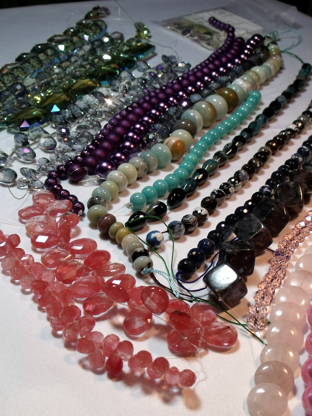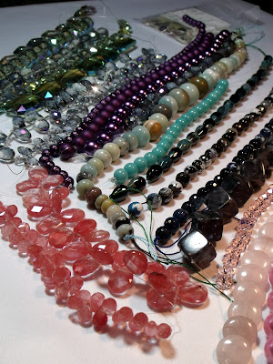 As you will see below, I think I did very well and found some really cool and beautiful beads, as well as a few unique looking ones. I snagged lots of larger crystals with different reflective hues - greenish tints, blue/purples, and oranges - in a variety of shapes - globes, large and smaller drops, flat teardrops, rectangles and hexagons. I also chose a few faceted round quartz in different blue mixed shades, various dark purple and pink glass pearls and crystals, beautiful cherry quartz faceted briolettes and small drops, light pink quartz discs, and large square labradorite. I also scouted out this great light aquamarine jasper mix in graduating size rondelles. Hope you enjoy my finds. Now it's time to put my creative hat on, and make some great jewelry pieces.