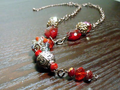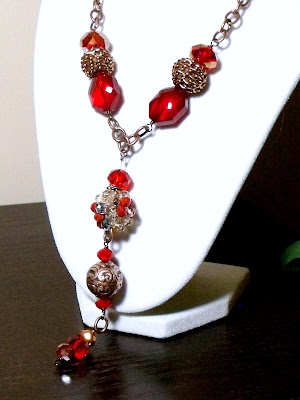 First up, I want to show you the deep red and polished copper on this Red and Copper T-Style Necklace. Large sumptuous red glass beads and crystal rondelles. And really cool looking copper wrapped around red glass spheres. Going down the middle, there is a unique looking hollow sphere made up of clear, white and rusty red rondelles, a metal copper embellished bead and crystal rondelles to finish it up. Lobster clasp makes it adjustable from 18" up to 20" around the neck-line, the bottom of the 'T' hangs down the chest from 22"-24".
